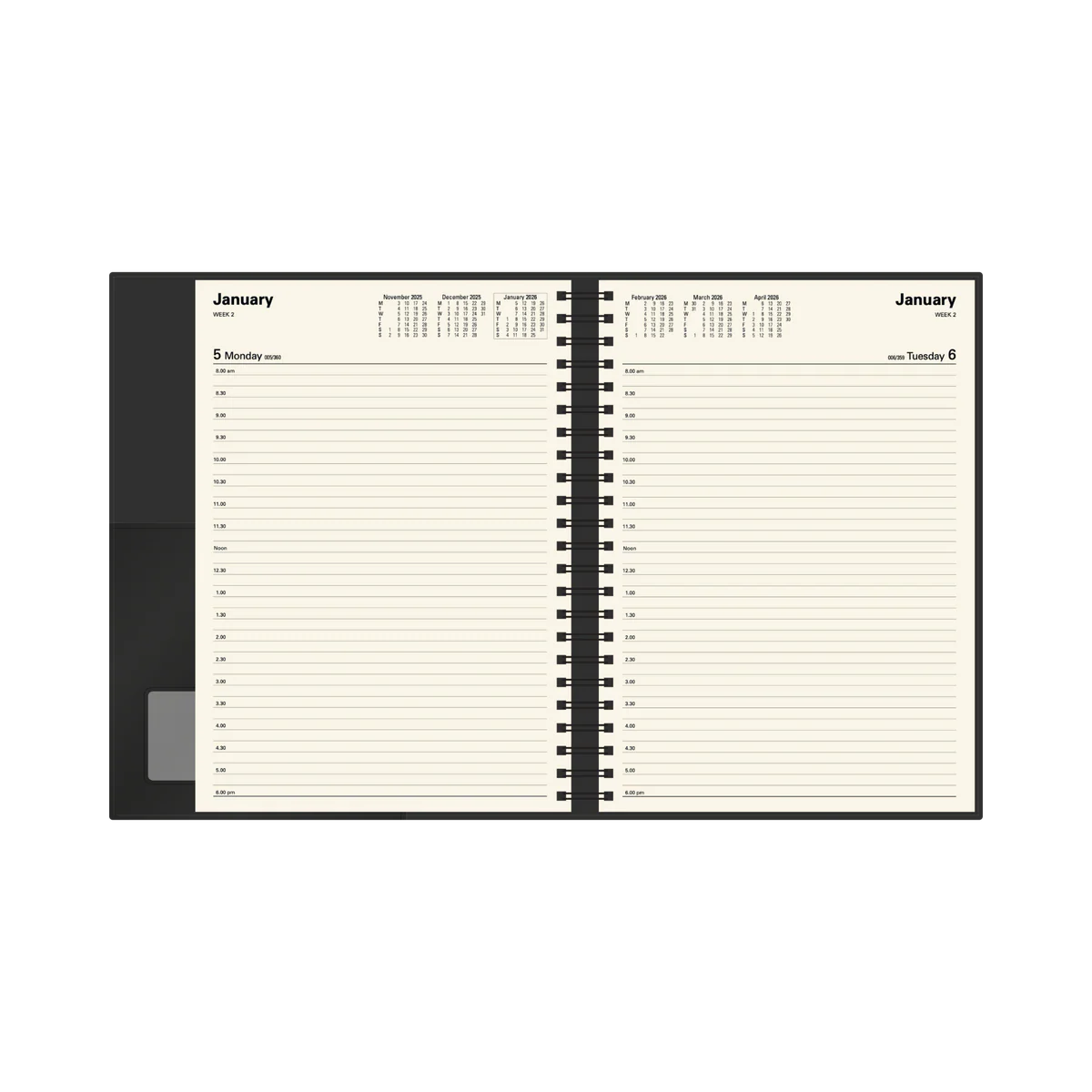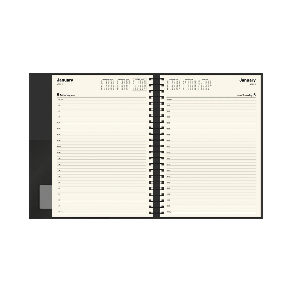 Printed on subtle cream 70gsm paper, each page layout provides a day-to-page format, including a six-month-to-opening calendar, week numbers, Julian days, and both national and international public holidays. The diary also includes a convenient internal storage pocket for notes, documents, or receipts.