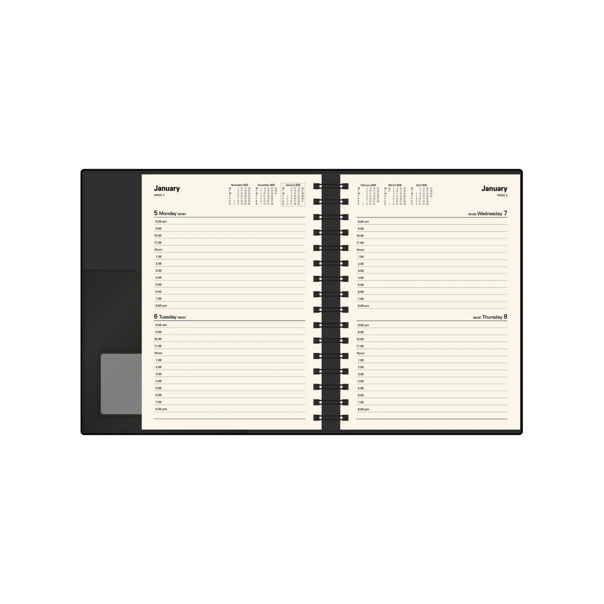 The Vanessa 2026 A5 2-Days-to-a-Page (2DTP) Diary is the ideal choice for professionals seeking a balance of durability, style, and functionality. Designed for portability and daily planning, this diary combines a double wiro binding with a heavy-grained metallic and matt PU cover, ensuring it withstands everyday use while maintaining a professional appearance.