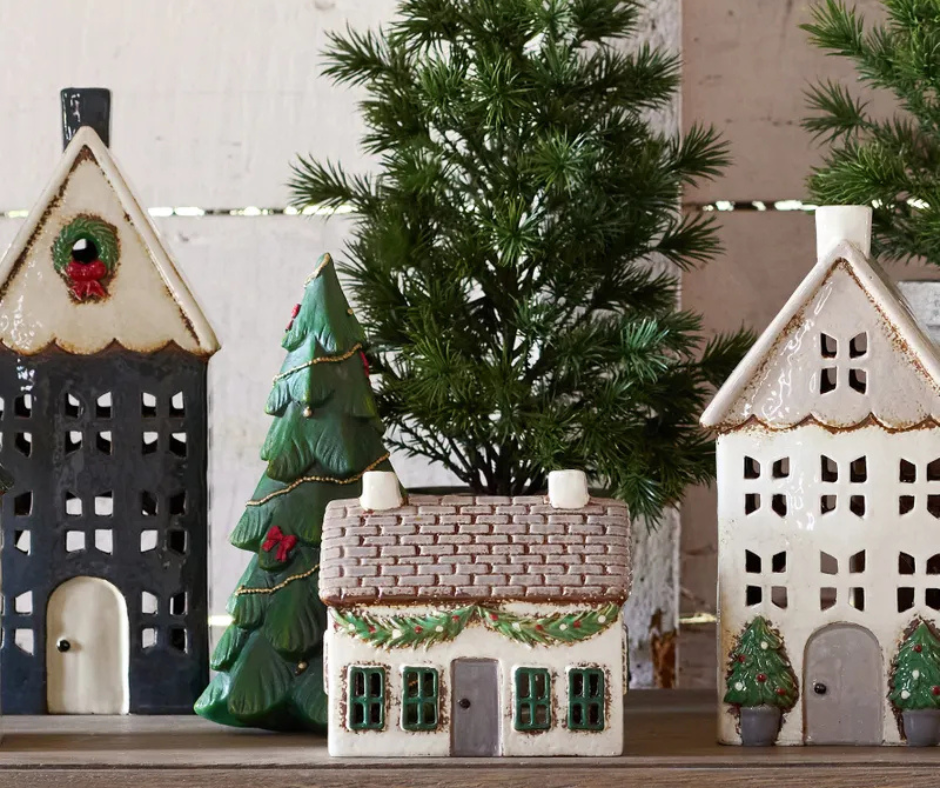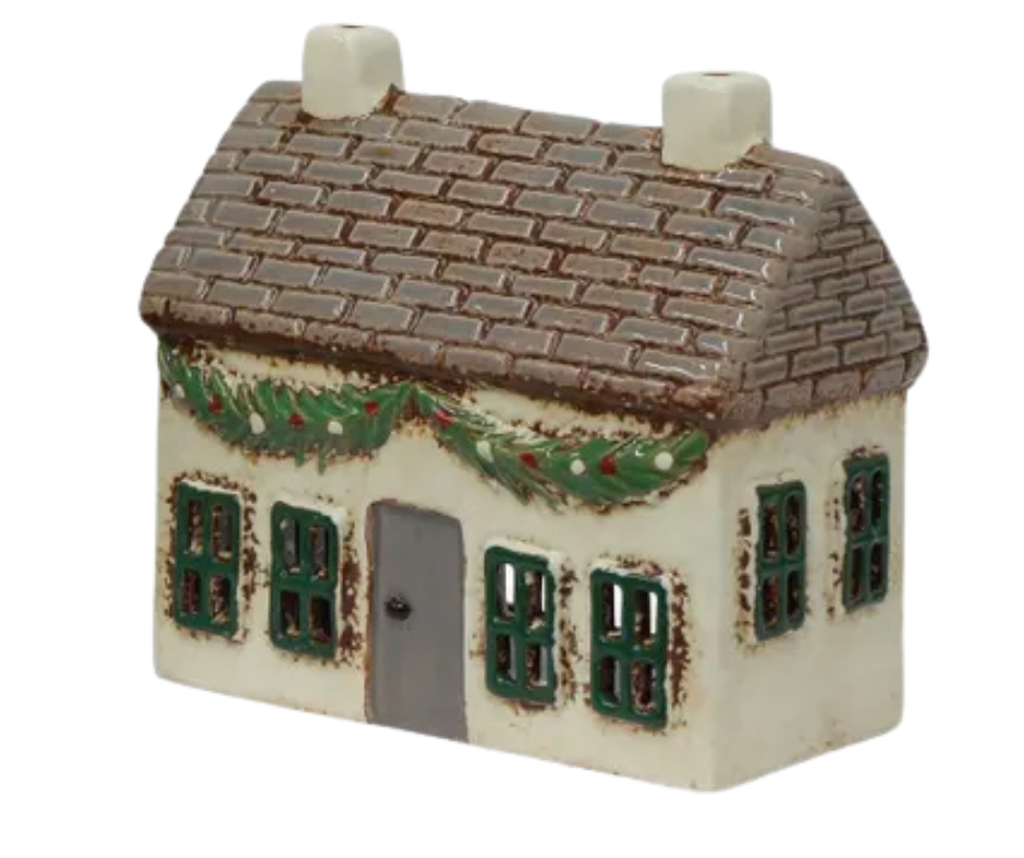 Christmas Tea Light Cottage with Swag – Hand-Painted Ceramic Holiday Decor